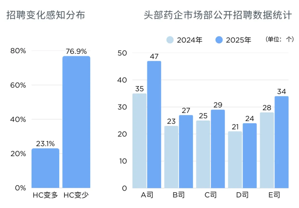 超七成受访者(77%)反馈所在团队 HC 缩减,折射出行业组织精简,人员优化的整体态势。与此同时,我们结合5 家头部药企公开招聘数据对比发现,2025 年市场部的公开招聘岗位数量,相比 2024 年有不同程度的增加。