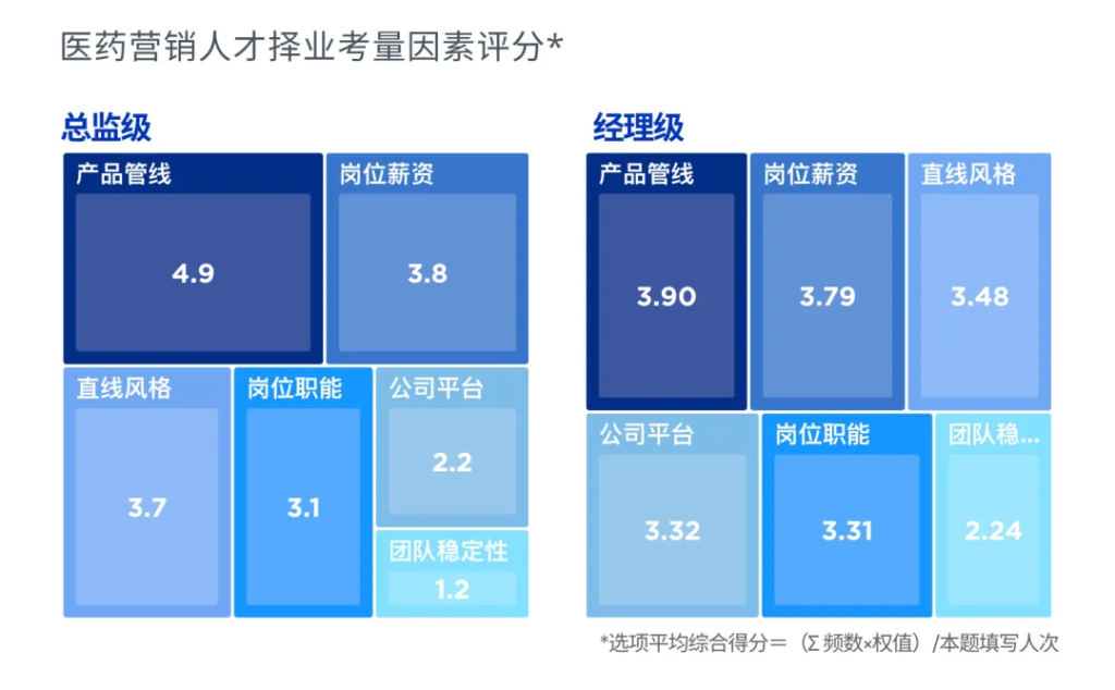 “产品管线”在“总监”与“经理”级问卷中均高居榜首,是人才择业时最直接的驱动力。以产品管线为核心,个人回报、上级管理风格构成了人才决策的铁三角。