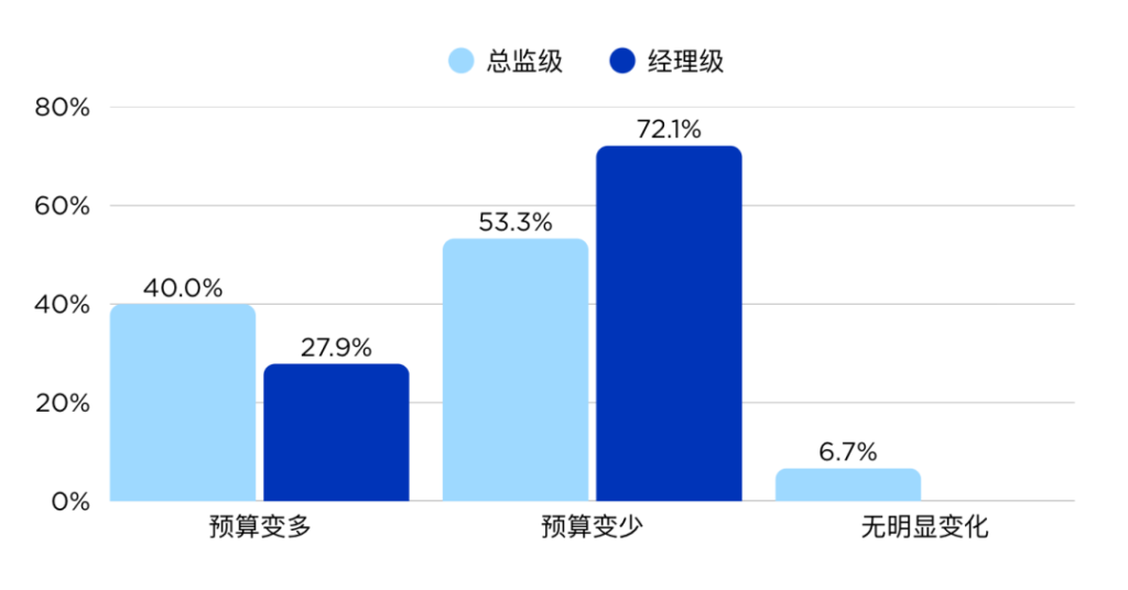 值得关注的是,预算缩紧虽成行业主流共识,但总监级中仍有 40%感知预算增长。