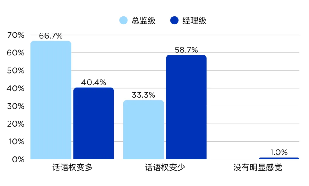经理级受访者中 58.65%反馈跨部门话语权减弱,而总监级中 66.67%认为话语权提升,呈现出相反的趋势。