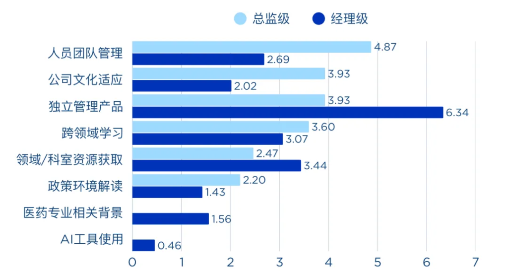 经理级则更关注和日常工作紧密相关的实操能力与资源储备,领域 / 科室资源获取能力(3.44 分)排在第二位,这说明在产品推广过程中,“可直接转化为工作成果” 的实操技能与资源整合能力,依然是衡量经理级市场人工作成效的核心标准。
